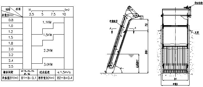在電機(jī)驅(qū)動下,通過減速機(jī)減速后,帶動鏈輪與鏈條運(yùn)動,固定在回轉(zhuǎn)鏈條上除污齒耙鏈條在柵后運(yùn)動到底部,經(jīng)過導(dǎo)輪后翻轉(zhuǎn)到柵前迎水面的位置,繼續(xù)運(yùn)動插入固定柵條的間隙中上行,把柵前攔截的污物提升帶出水面,并隨著鏈條的運(yùn)動到出渣口處自動翻轉(zhuǎn),污物自卸到格柵后的輸送機(jī)或渣桶中,完成除污過程,液體則通過柵條的柵隙流過,整個(gè)工作狀態(tài)連續(xù)循環(huán)進(jìn)行。