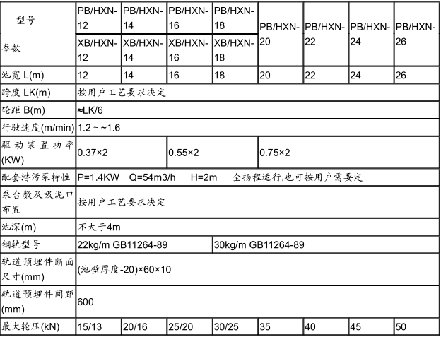 P·XB/HXN 行車式吸泥機(jī)一般由多臺潛污泵組成吸輸泥系統(tǒng)、斷流閥、主梁、端梁及驅(qū)動裝置、控制柜、