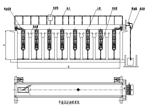 主梁由兩端梁上的驅(qū)動裝置帶動,沿鋪設(shè)在池頂上的軌道行駛,隨主梁一同運(yùn)動的潛污泵將沉積在池底