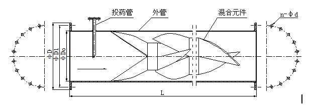 如圖所示,管式混合器由投藥管、混合元件和外管組成。投藥管置于混合器上游,原水加藥劑后,經(jīng)過各混合元件時產(chǎn)生